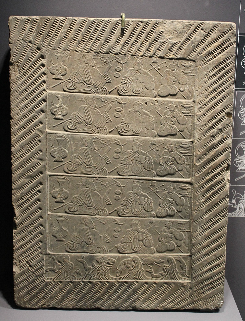 두 男子가 마주앉아 술잔을 기울이는 場面이 5단에 걸쳐 反復되어 있는 畵像塼이다. 이 場面을 통래 古代人들이 宴會에서 술을 즐기던 모습과 더불어 당시 使用하던 器物을 살펴볼수 있다. 가운데 ㅇ낮아있는 두 사람은 소매가 넓은 上衣와 통 넓은 바지를 입었는데 뒤쪽에는 칼이 한 자루씩 놓여 있다. 왼쪽사람은 武士의 武官을 썼고 오른쪽 사람은 文官의 進賢冠을 썼다. 背景에는 왼쪽부터 손잡이가 달린 靑銅 술병과 귀달린잔 술단지 술을푸는국자 상 위에 飮食을 단은 넓은 접시와 꼬치 같은 안주가 보인다. 두 文武官이 칼을 지닌채 술자리를 갖는 묘한 會合의 場面은 眞 末期에 項羽와 劉邦이 咸陽 爭奪을 둘러싸고 興門에서 칼춤을 보며 宴會를 벌인 興門蓮 古事를 연상 시킨다.