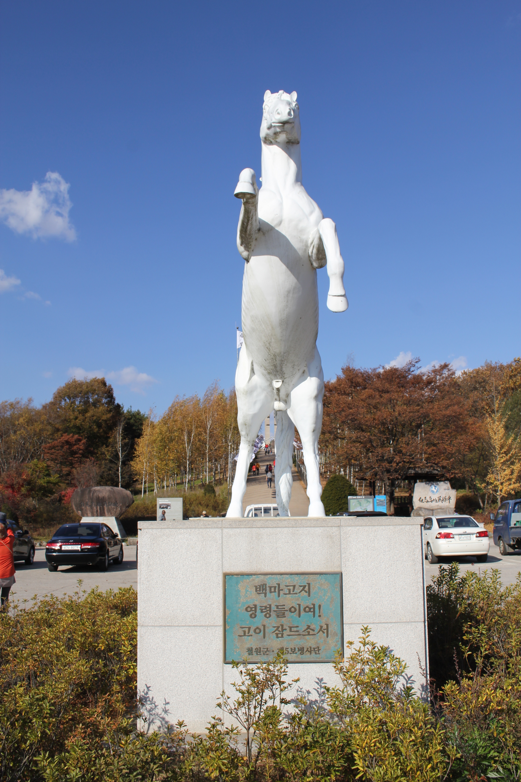 1952년 10월 6일부터 中共軍 2개 師團과 10일 동안 主人이 스물 네번이나 바뀌었던 戰績地. 당시 흙먼지와 屍體가 뒤엉켜 惡臭가 코를 찔렀으며 砲擊으로 山이 本來의 모습을 잃고 있었는데, 그 모습이 마치 白馬가 누워있는 形狀과 같다하여 白馬高地로 불리게되었다.