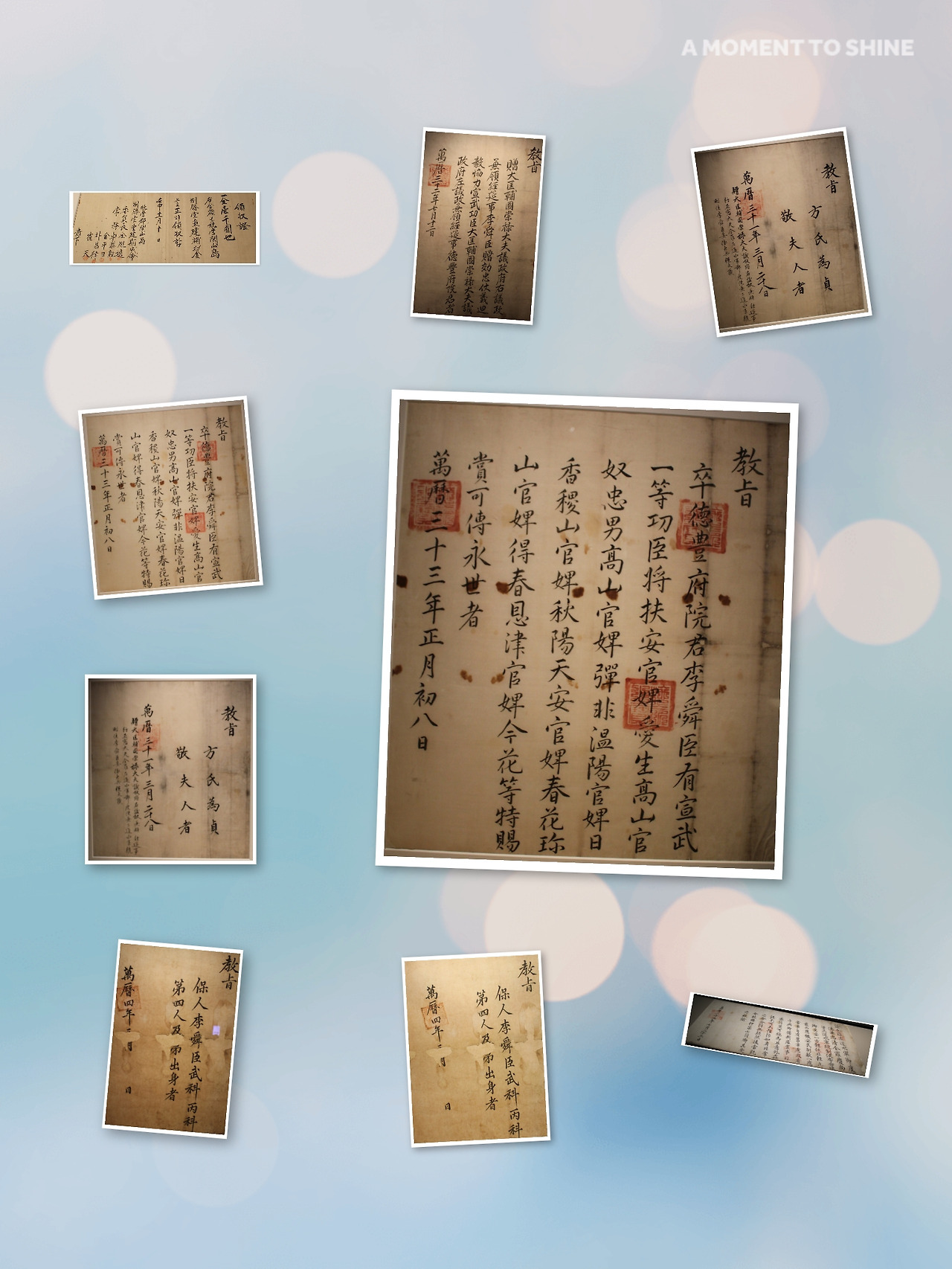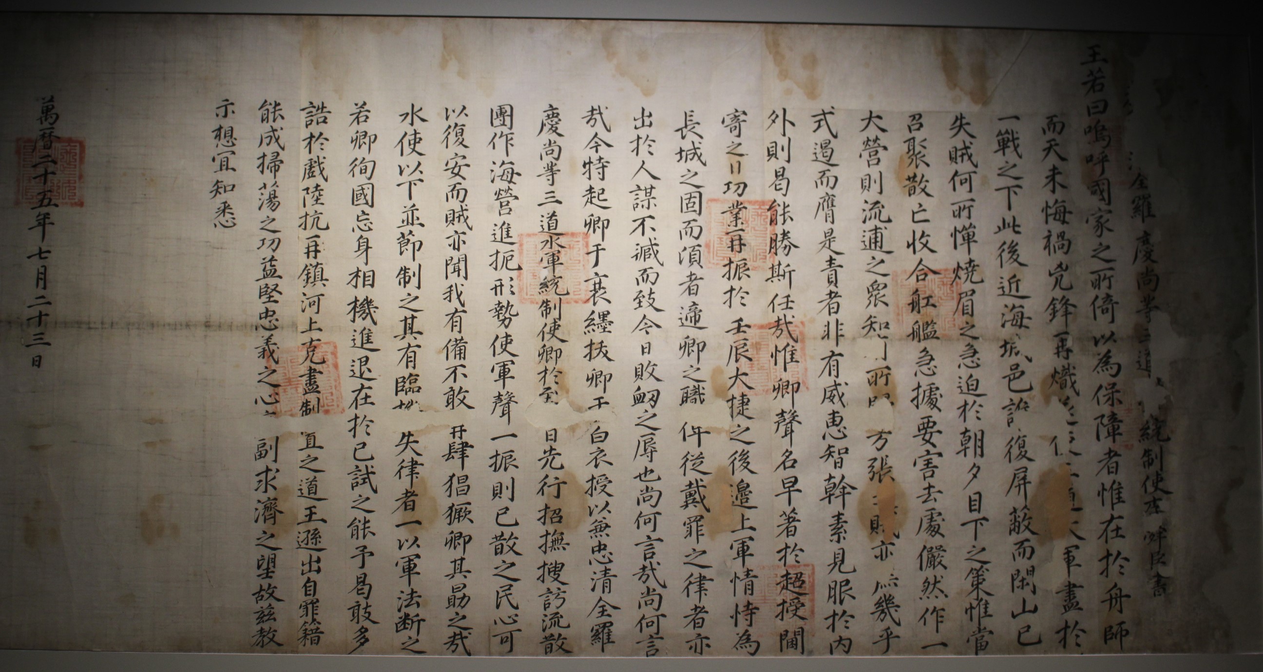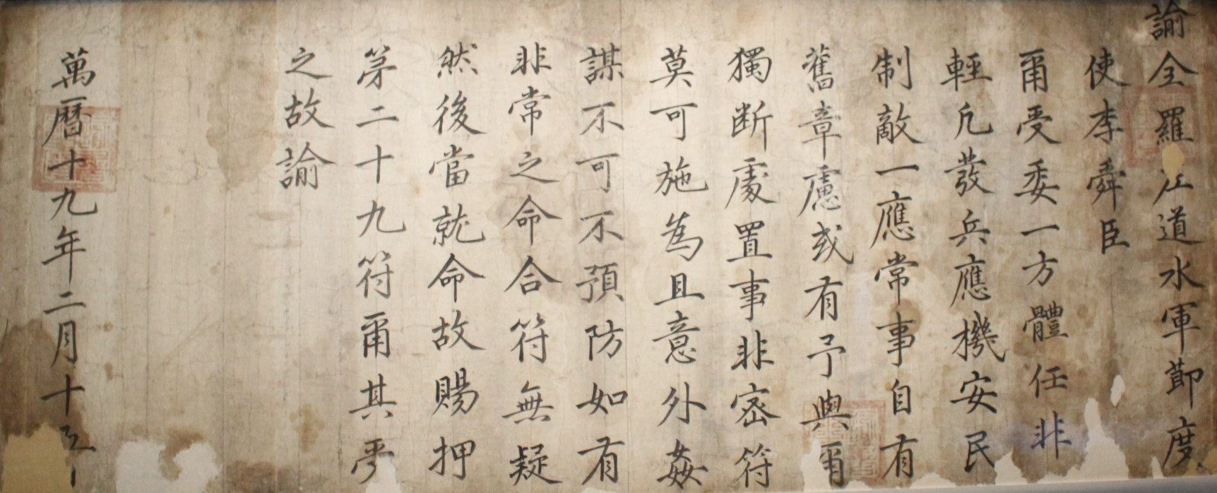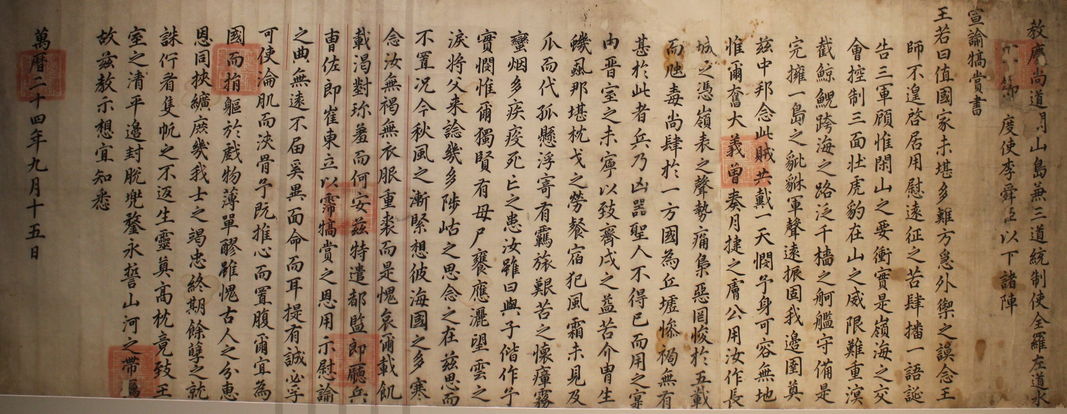 1596 년 宣祖가 兵曹佐郞을 보내 李舜臣과 軍事들에게 飮食을 베풀며 賞을주고 잔치를 베풀며 勞苦를 위로하는 文書이다. 이 敎書에서 宣祖는 邊方을 든든히하고 나라안을 便安하게 한것은 李舜臣과 水軍이 勇猛하게 지켰기 때문이라고 칭찬하면서 그에 걸맞은 處遇를 해주지 못하고 있는 狀況에 부끄러움을 표했다. 이 敎書가 내려질 무렵 明과 日本이 强化 協商이 決裂되었다. 戰爭의 休止기가 끝나가던 時點에서 李舜臣과 水軍의 役割이 다시한번 注目받을 때였다.