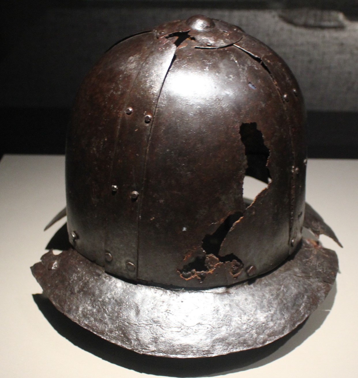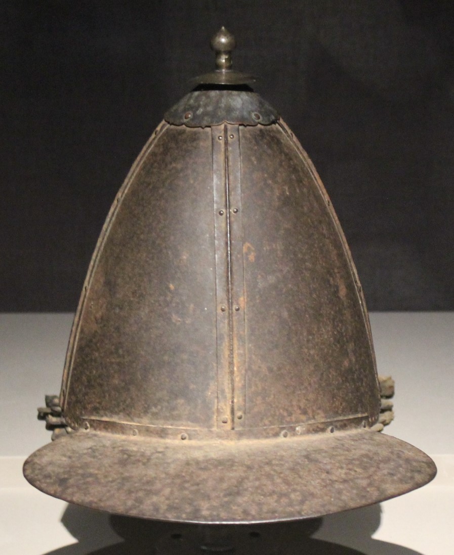 柳成龍 이 입었던 갑옷의 잔편과 簷胄이다. 돼지가죽 미늘에 사슴가죽끈을 엮어 만들었다. 가죽을 直四角形으로 자르고 가장자리를 둥굴린후 바깥쪽에서 흑칠을 하였다. 簷胄는 챙이 붙은 원뿔 模樣의 모자 테두리에 쇠비늘을 엮어 만든 볼가리개와 뒷가리개로 構成되어 있다. 李舜臣도 이와같은 形態의 갑옷과 簷胄를 입었을 可能性이 있다. 柳成龍은 壬辰倭亂때 領議政과 도체찰사로서 內政과 軍事業務를 總括하였다. 특히 壬辰倭亂이 일어나기 1년전 1591 년 李舜臣을 조정에 推薦하여 全羅左水使에 任命되도록 한것이 그의 功이었다.
