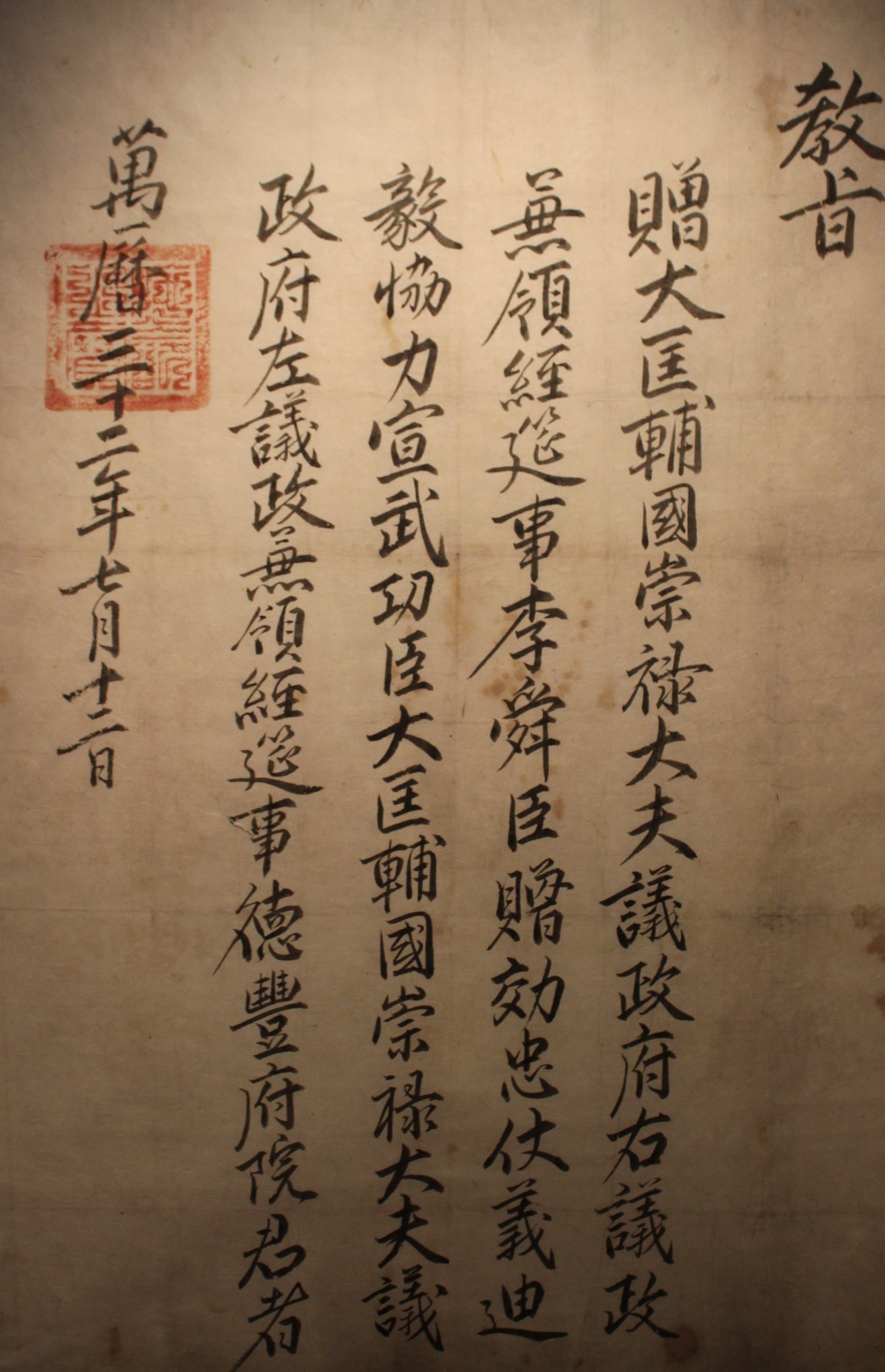 1604 년(宣祖 37) 李舜臣을 宣武一等功臣에 錄勳할때 左議政으로 追贈 하면서 내린 敎旨이다. 李舜臣은 戰死한 直後인 1598 년 (宣祖 31) 12 월 右議政에 追贈 되었는데 이때 다시 左議政으로 贈職 되었고 正1品 功臣에 내려지는 府院君 稱號도 함께받았다. 府院君 봉호는 덕수 이씨의 관할 京畿道 개풍군 덕수리를 따라 덕풍으로 定했다.