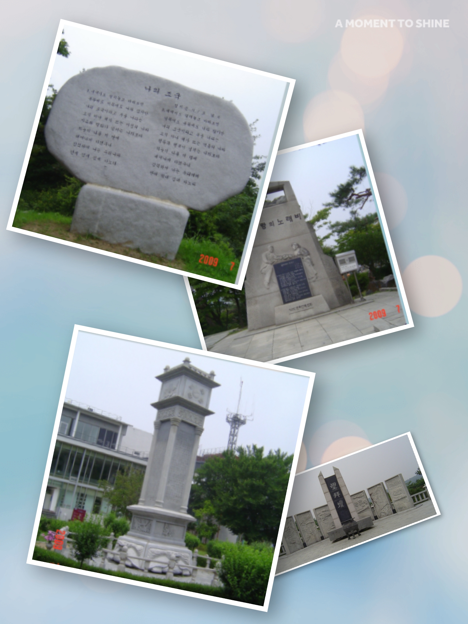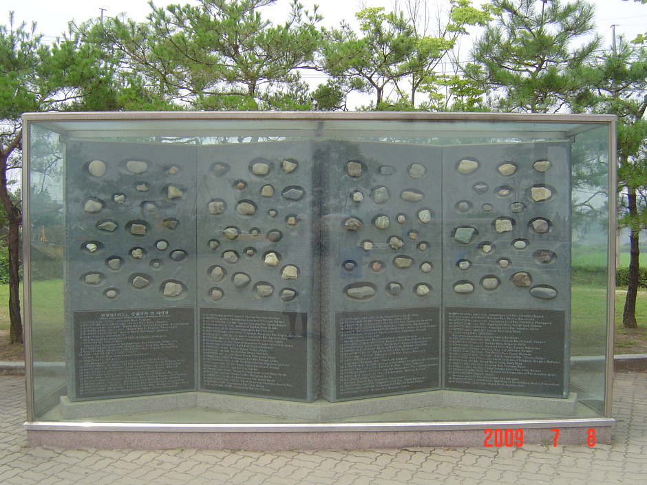 이 造形物은 세계 戰爭터의 한과 슬품이 서린 돌을모아 만들었읍니다. 世界 64개국 86개 戰場에서 보내온 이돌들이 새 千年에는 苦痛과 갈등을 넘어 民族和合과 人類平和의 디딤돌로 되살아나기를 간절히 祈願합니다. 경기도지사 임 창 열